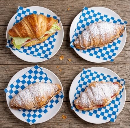 A golden, flaky, all-butter croissant filled with rich, creamy Nutella. Topped with a delicate chocolate drizzle or a dusting of powdered sugar.